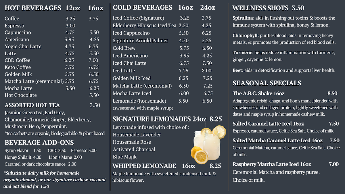 For those seeking warm comfort, their Wellness Lattes are a must-try. The Golden Milk Latte is a delightful fusion of turmeric and cashew milk, promoting a serene experience. Seasonal specials, like the ABC Shake, further showcase their commitment to wholesome ingredients.